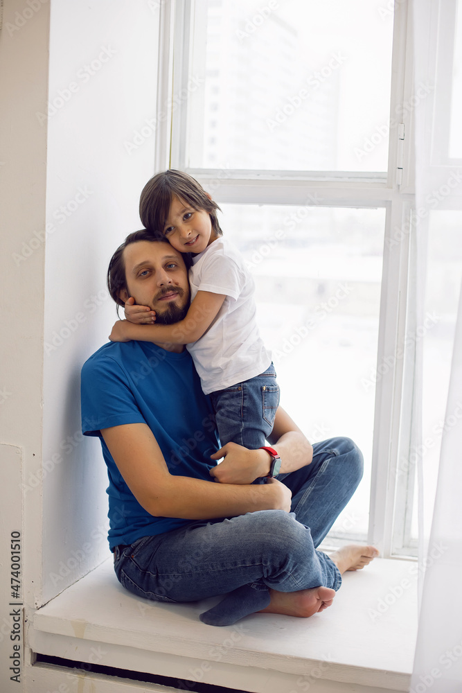 father in a blue T-shirt and a son in a white T-shirt are sitting on the windowsill large window