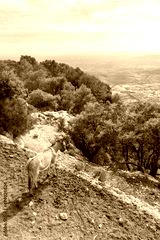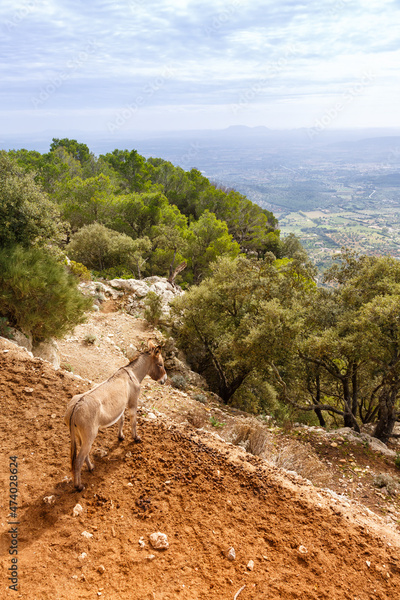 Donkey with view on landscape scenery at Castell Alaro Mallorca travel traveling holidays vacation portrait format in Spain