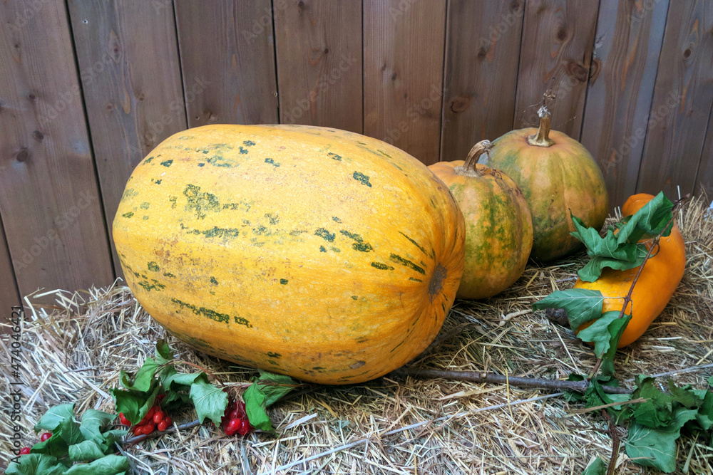 Still life of yellow pumpkins with greenery on straw and wood background