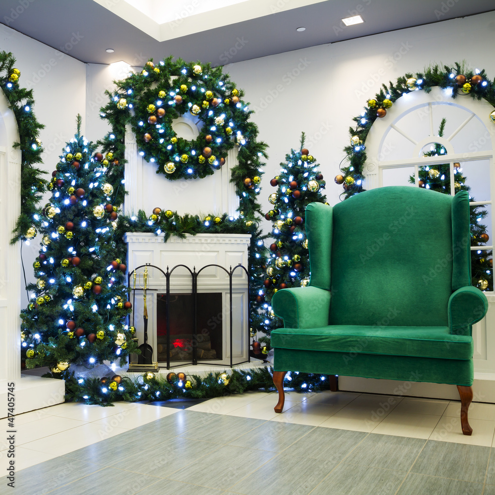 Christmas living room with fireplace