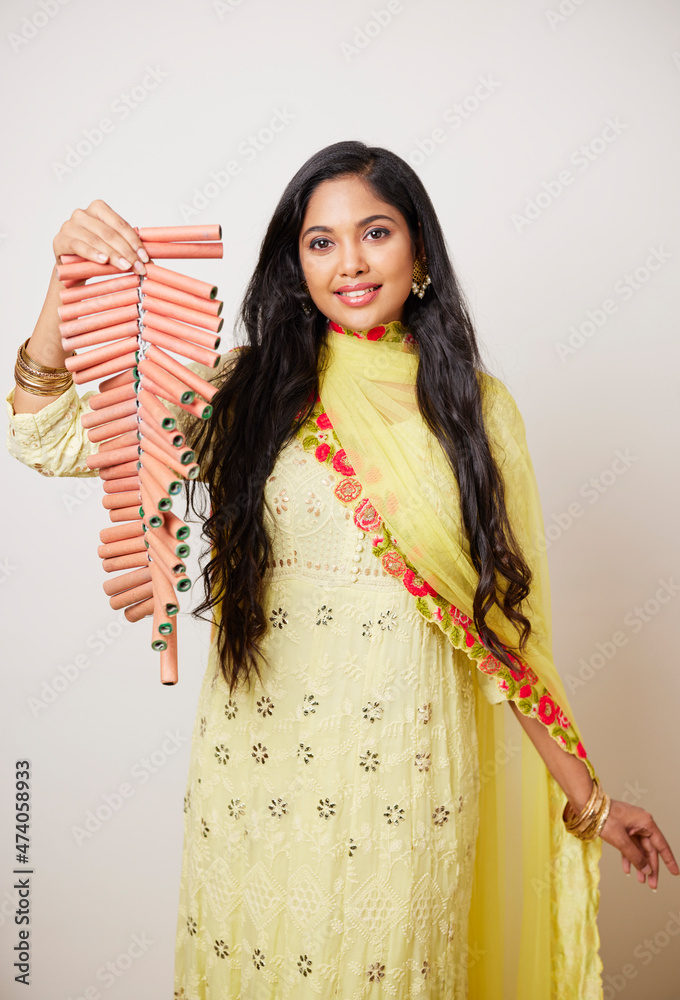 Indian pretty young woman celebrating Diwali festival with fire crackers.