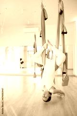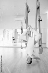 Vertical full length shot of a woman relaxing after aerial yoga class, hanging upside down in fly yoga hammock