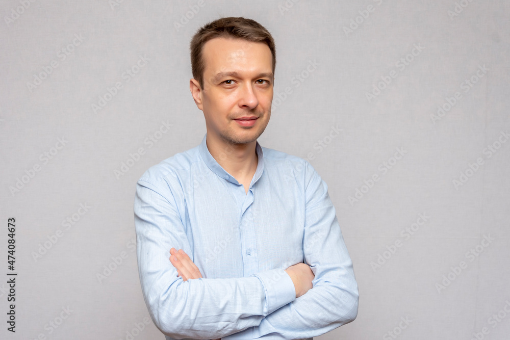 Smiling brunette in a light shirt, looking at the camera, holding his arms crossed, on a gray background.