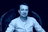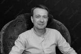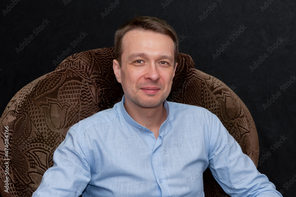Portrait of a smiling man 30-35 years old in a blue shirt, sitting in an armchair on a black background. Perhaps he is a lawyer or a lawyer, a coach or a psychologist.