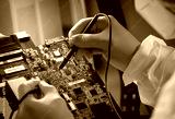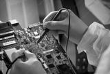 The scientist works in a modern scientific laboratory for the research and development of microelectronics and processors. Microprocessor manufacturing worker uses computer technology and equipment.