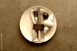 Festive Christmas meal background. Plate with knife and fork and Christmas decorations