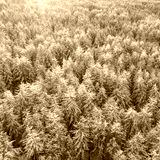 Amazing morning winter forest landscape. Aerial view of snow-covered larch trees. The tops of the trees are illuminated at sunrise. Cold snowy weather. Northern nature. Vacation in the wilderness.