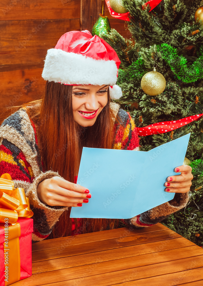 Pretty White Woman in a Casual Warm Sweater and Santa Hat Reading a Christmas Card Next to the Christmas Tree with Several Glitter Balls is Enjoys Reading Christmas Greetings. Copy Space.