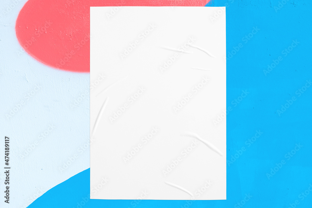 Closeup of colorful blue red white painted urban wall texture with wrinkled glued poster template. Modern mockup for design presentation. Creative urban city background.
