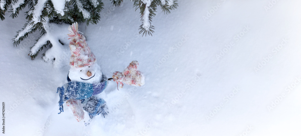 smiling snowman in a hat, mittens and a scarf, stands in a snowdrift under a tree top view. fun during winter holidays