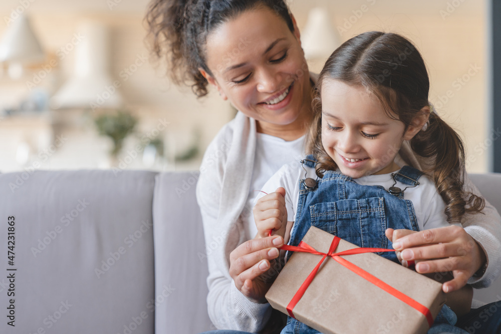 Mother and little daughter girl unwrapping unpacking birthday Christmas Mother`s day present gift box on family celebration event at home