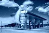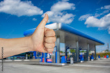 A man shows his thumbs up against the background of a gas station