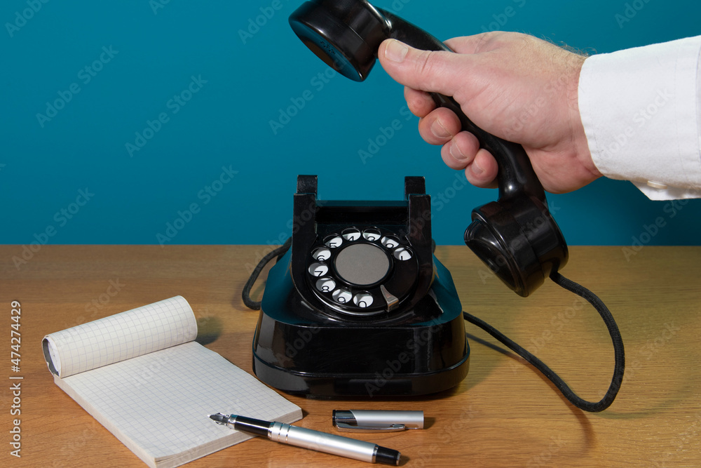 old black telephone on the table. dialing, notebook, ink pen. Copy space