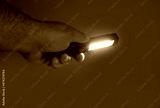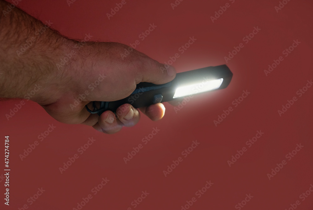 Pocket led flashlight in hand. illuminates red background. Copy space