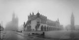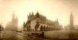 Krakow, Poland, main square panorama with Cloth Hall and St Mary's church on foggy November morning