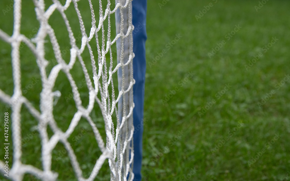 Small gates for playing football for children. Blue frame. On grass background. Copy space