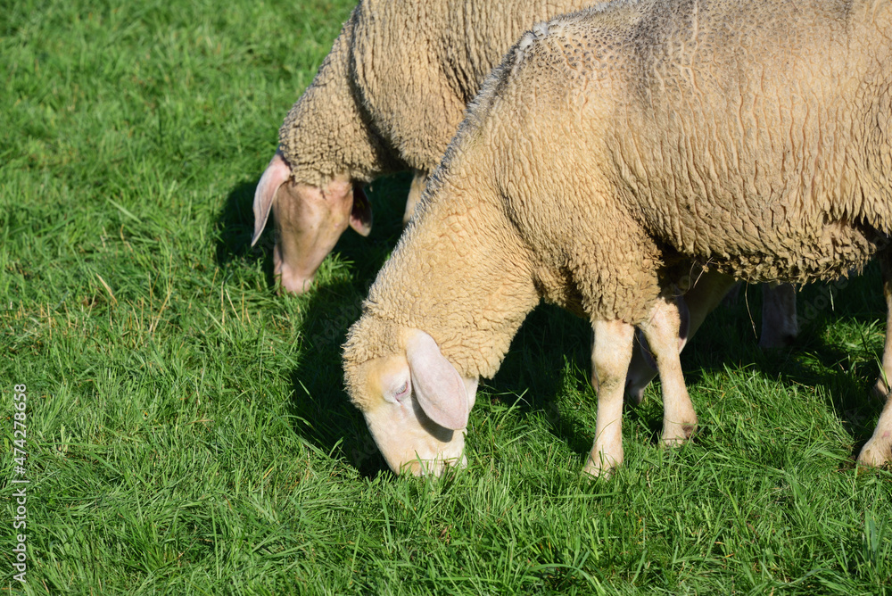 Two young white domestic sheep stand next to each other in a pasture and graze