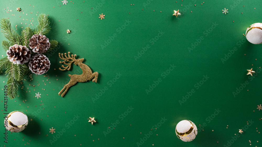 Christmas and new year background concept. Top view of christmas ball, reindeer, pine cone and snowflake on green background.