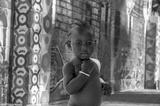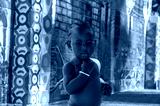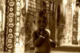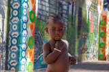 Little african black child stands near a colorful wall on a sunny day. 28.06.2021 Svakopmund. Nmibia