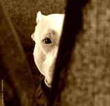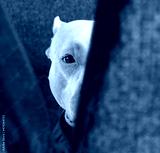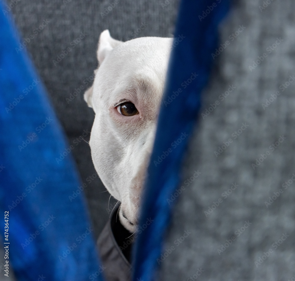 White dog head of bull terrier is hidden behind a seats at a bus.
