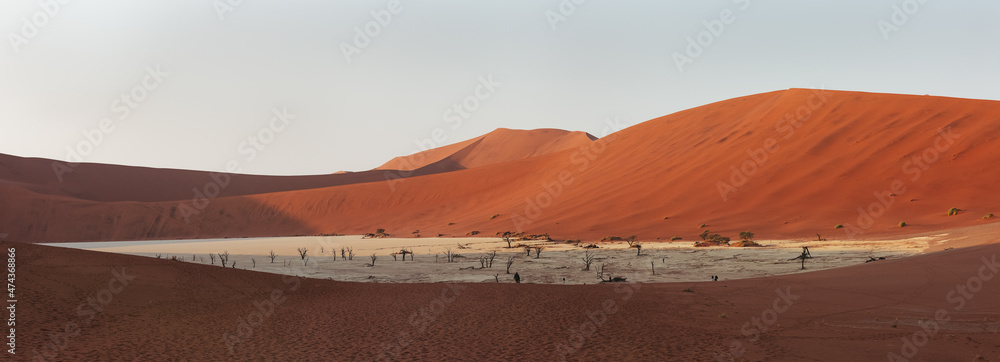 Panorama with sandy hills of red dunes and dead trees of Deadvlei valley in Sossusvlei area, Namib desert.
