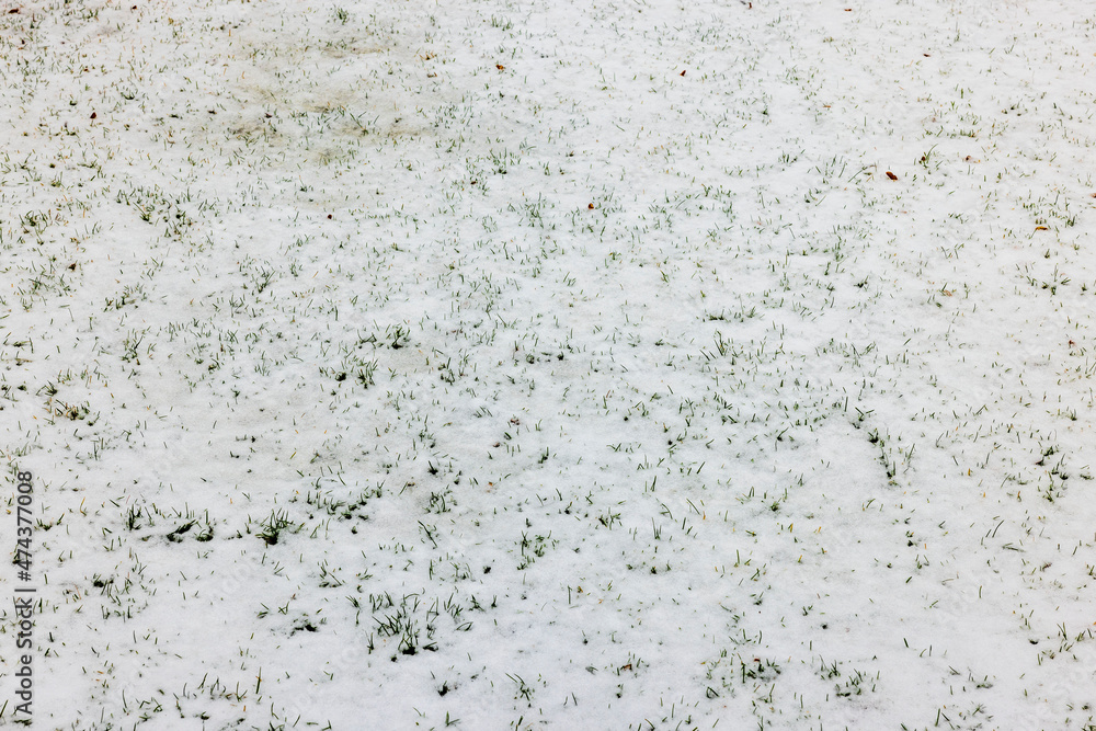 Gorgeous view of winter green grass under snow. Beautiful nature background, texture. Winter concept. Sweden.