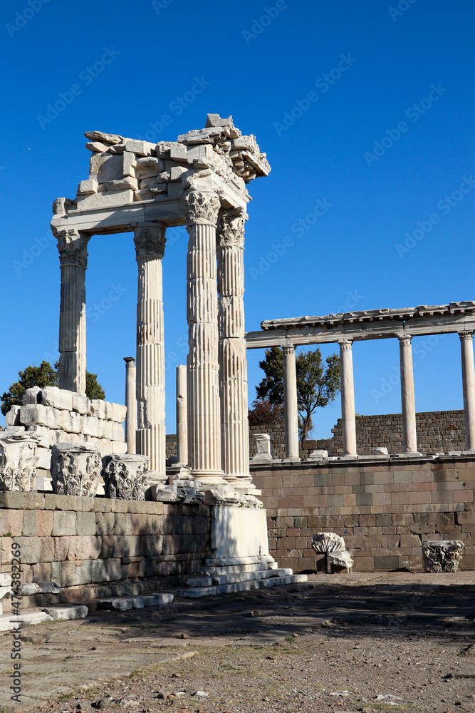 beautiful temple of Trajan with white marble columns on blue sky background, ancient city Pergamon, Turkey