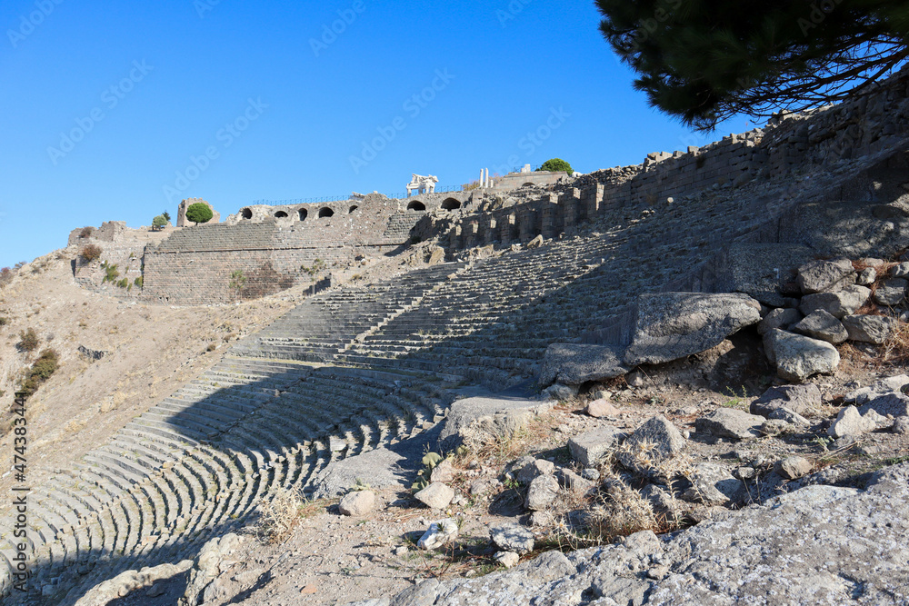 scenic view of ancient amphitheatre in Pergamon ruined city, Turkey - one of the largest and steepest theatre in the world