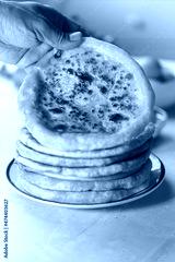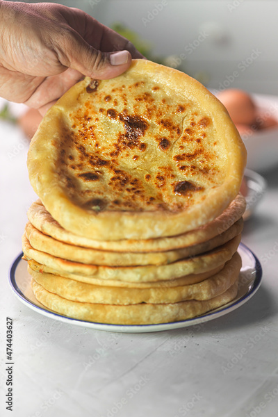 Man holding Khachapuri is cheese bread, traditional caucasian food on a white background with ingredients