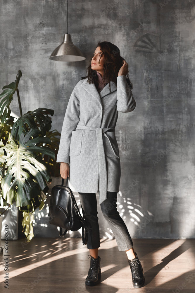 Indoor full-length portrait of an elegant woman wearing a grey trench coat, trendy shoes, posing with a classic black backpack. Autumn and spring fashion advertising concept