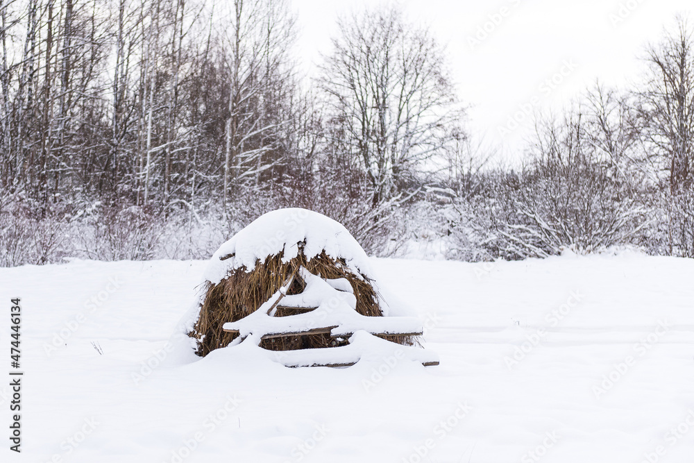Haystack wooden frame and hay on the field in snowy winter day