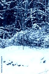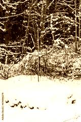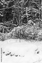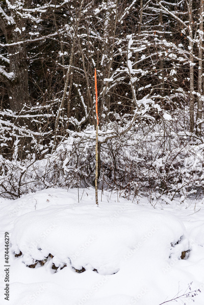 The boundary point mark of the land plot and orange pole in it in snowy winter day, Latvia