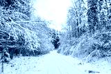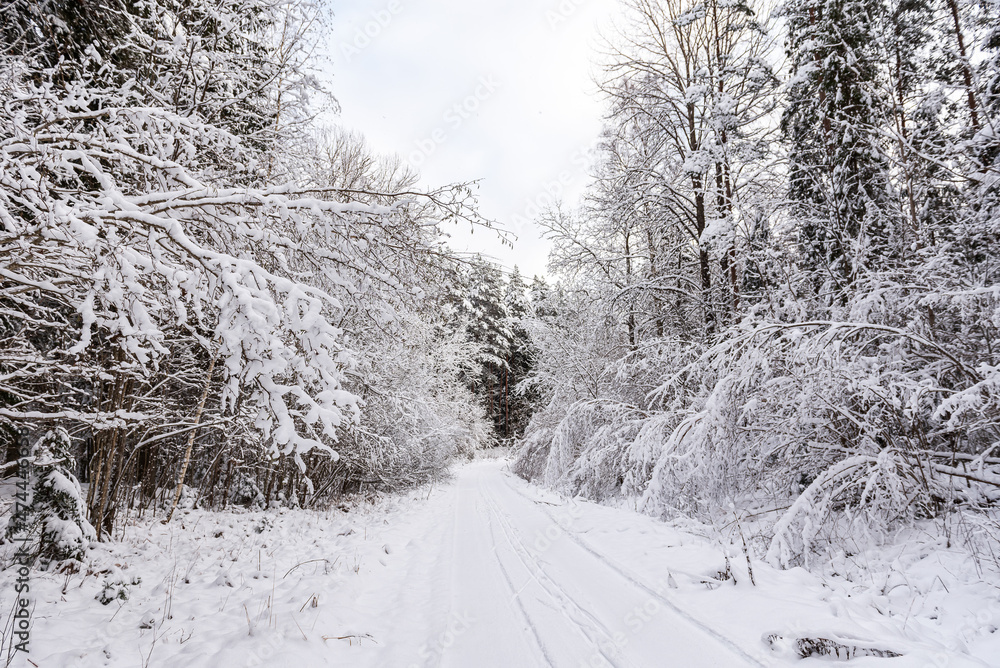 Forest road on a snowy winter day. The trees are bent by the weight of the snow