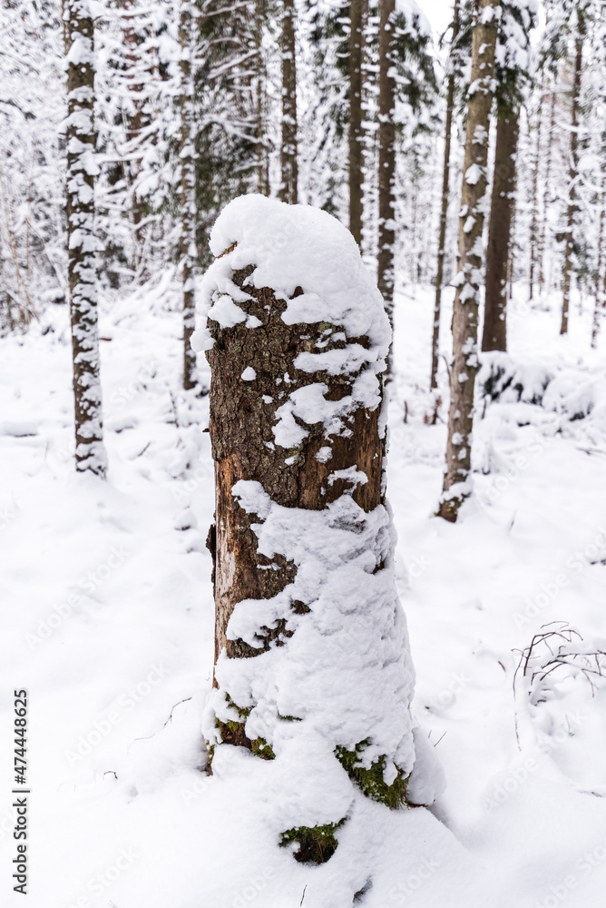 A stump of broken wood in the forest on a snowy winter day
