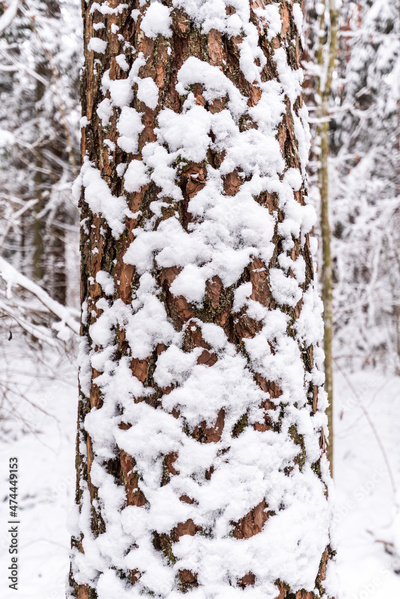 A snow-covered pine trunk in the woods on a snowy winter day