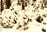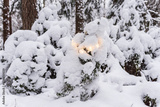 Small spruces in the forest on a winter day. One of the spruces is decorated with a chain of yellow lights