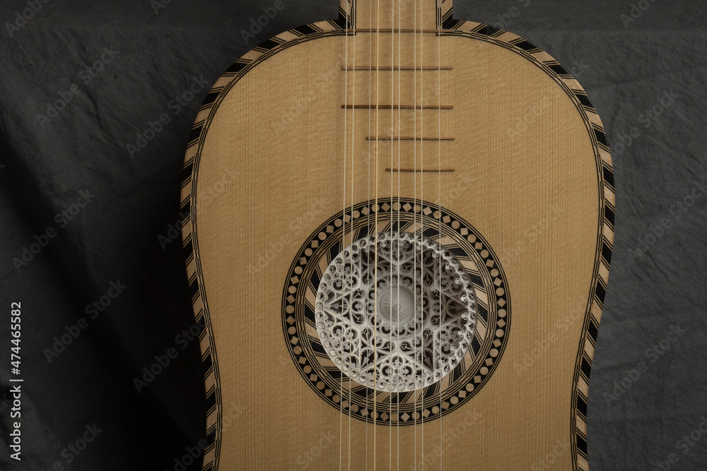 Baroque guitar of the 17th century. Close-up details