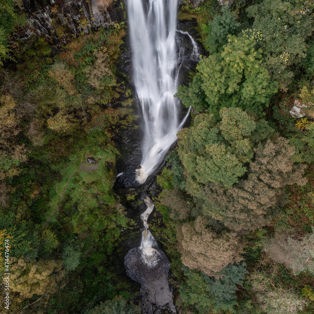 Aerial flying drone bird's eye view Beautiful long exposure landscape early Autumn image of Pistyll Rhaeader waterfall in Wales