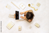 Christmas. Woman in sweater using laptop for searching gift ideas sitting on the white carpet among the many wrapped boxes in white gold wrapping paper. Top view. Concept