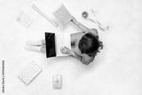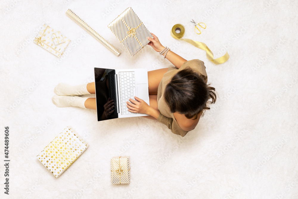 Christmas. Woman in sweater using laptop for searching gift ideas sitting on the white carpet among the many wrapped boxes in white gold wrapping paper. Top view. Concept