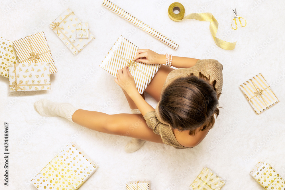 Female wrapping christmas gifts boxes for family sitting on fluffy snow-white carpet. Top view.