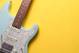 Electric guitar on yellow table background, flat lay, music instrument concept