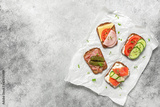 Various sandwiches with ham, bacon, vegetables and salmon. Gray grunge background. Top view, flat lay,