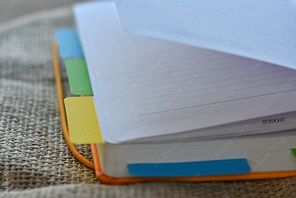 timing. planning for the new year. notebook with calendar 2022 with many colorful bookmarks