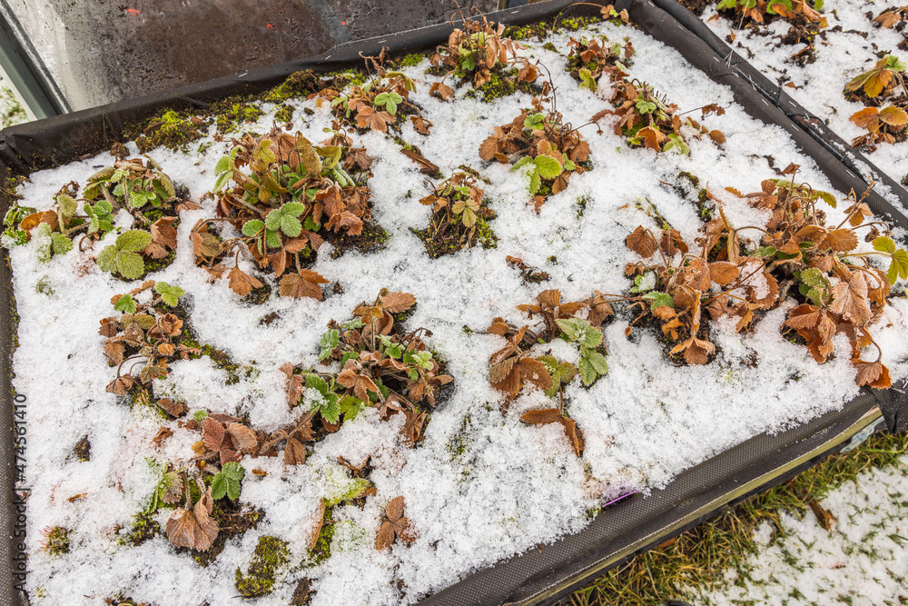 Gorgeous winter view of growing a strawberry plants growing in pallet collars. Beautiful winter nature backgrounds. Gardening concept. Sweden.