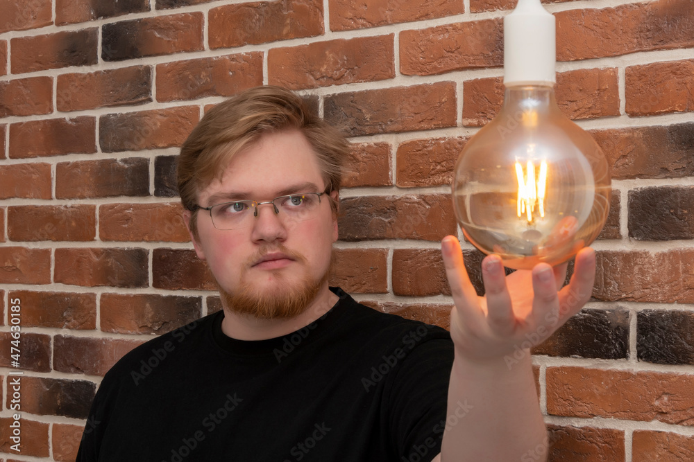 A bearded man with a light bulb on against a brick wall. Concept: connection and disconnection of electricity, room lighting