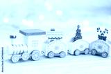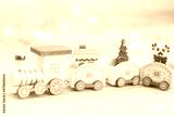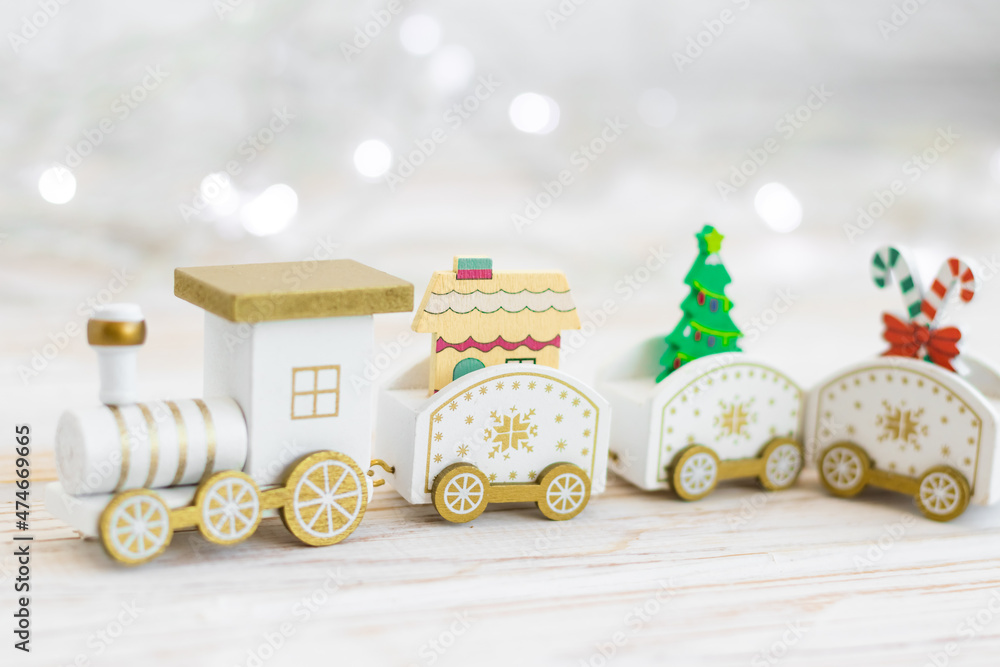 wooden toy locomotive, Christmas and New Year concept, blur, on white background