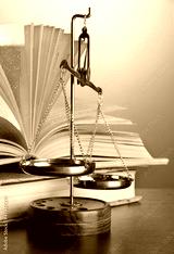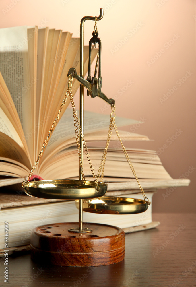 Gold scales of justice and books on brown background