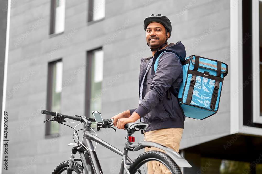 food shipping, profession and people concept - happy smiling delivery man with thermal insulated bag and bicycle on city street