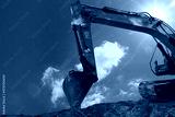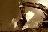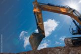Excavator digging the soil In the construction site area on blue sky and sun background